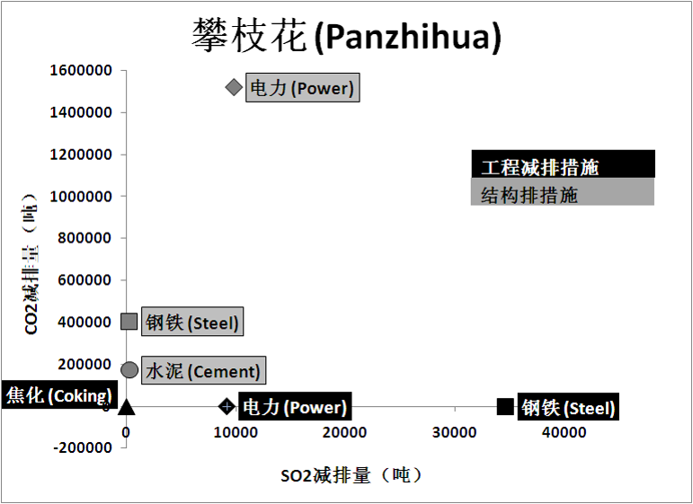 最直接的量化协同效益的方式就是看一项措施分别能减少多少温室气体和大气污染物。如下图中攀枝花案例。尽管能有效减少二氧化碳排放的措施有多种,但其中只有对电力部门进行结构性减排,才能获得最好的协同效益。