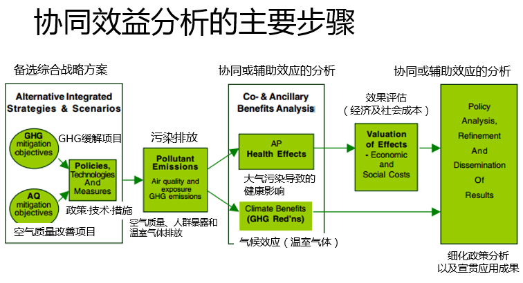 在实际政策制定中,往往需要考量更多的因素,如措施对经济和公众健康的影响。这就需要定量评估协同效益。量化包括五个主要步骤:找到问题并设定治理目标、制定环境措施及计划方案、收集数据、建立模型、实施政策措施。
