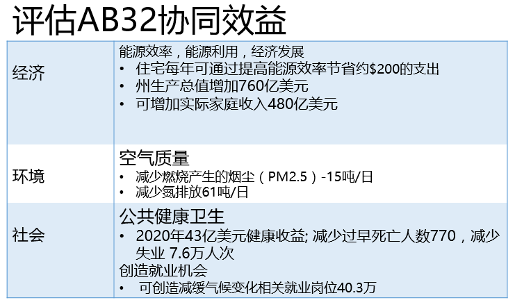 如对美国加州的《气候变化法案(AB32)》中5个部门44个行业的措施进行评估,包括所花费的费用、节能效益和大气污染物减排效益,发现改法案在经济、环境及社会方面,均可带来可观的效益(见下图)。